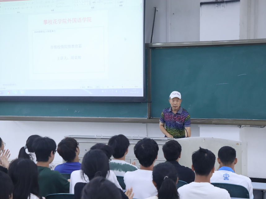 周荣辉老师从攀枝花市历史、攀枝花三线建设精神、攀枝花学院校史校情和外国语学院的发展四个方面进行了分享。活动伊始,周老师语重心长地为新生讲解了攀枝花市的建设历史,这是一部充满辉煌和奋斗的史诗,它见证了新中国工业化的伟大历程,彰显了三线建设者顽强拼搏的精神。期间,它铸就了“艰苦创业、无私奉献、团结协作、勇于创新”的三线精神,成为激励后人不断前进的强大动力。
