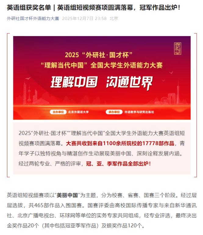12月7日,2025年“外研社·国才杯”“理解当代中国”全国大学生外语能力大赛全国总决赛在北京举行,我校外国语学院参赛团队(团队成员:祝定逸、高科、陈帆、胡安乔;指导教师:严艳、刘小宇、付乔)荣获全国总决赛银奖。外国语学院与基础医学院组成的跨学院团队(团队成员:陶可怡、周欣平;指导教师:严艳、刘小宇、陈怡)荣获全国总决赛铜奖。实现我校学子在该项比赛全国总决赛中获奖零的突破。