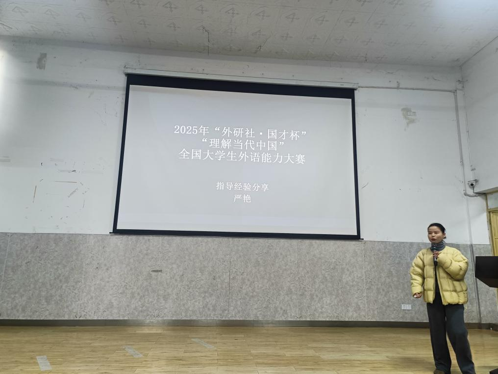 首先,严艳老师以2025年“外研社·国才杯”“理解当代中国”全国大学生外语能力大赛的指导工作为例,详细分享了学科竞赛的备赛历程、指导学生取得优异成绩的心得体会,并就如何更系统、高效地组织未来竞赛培训工作提出了切实可行的建议。