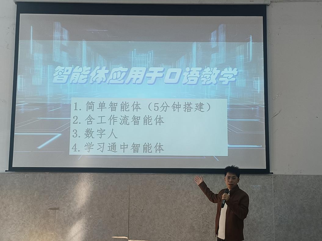 之后陈怡老师重点探讨了人工智能技术在口语教学中的具体应用。他介绍了智能体、数字人等新型工具在创设对话场景、提供个性化反馈、辅助发音练习等方面的实际应用情况与初步成效,展望了技术赋能下口语教学模式变革的潜力。