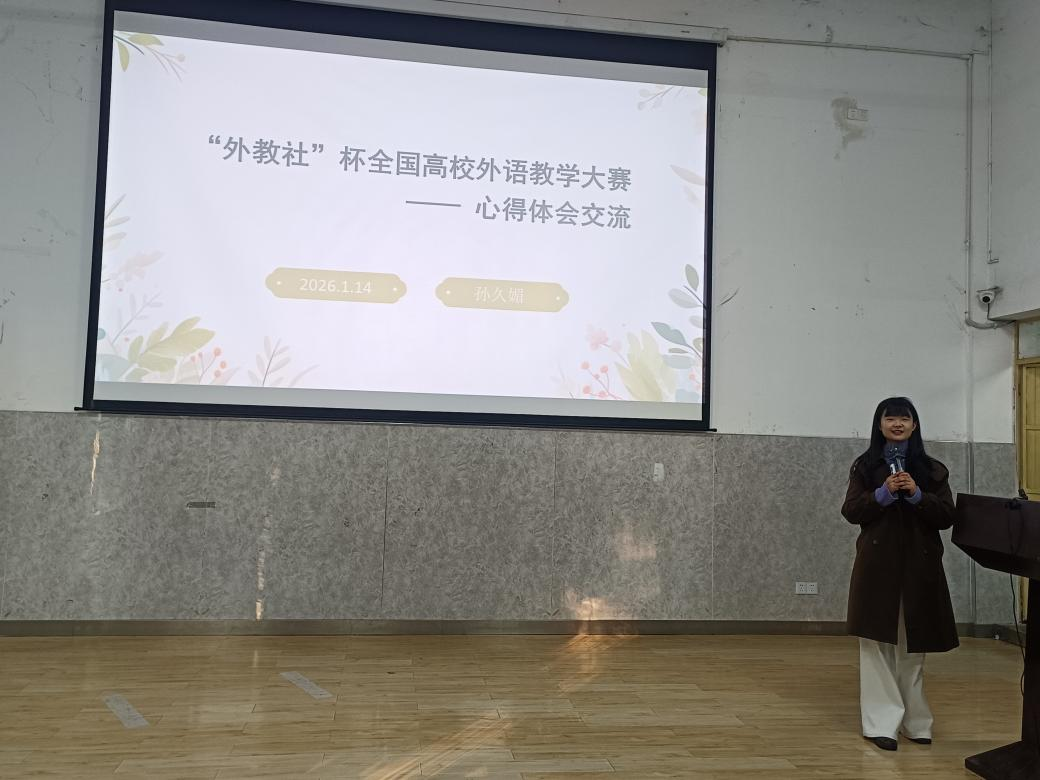 然后孙久媚老师聚焦“外教社杯”全国高校外语教学大赛,交流了参赛的心路历程与备赛过程中的思考与收获。她围绕教学理念、课程设计、现场展示等关键环节,分享了提升教学竞赛水平与综合教学能力的经验。