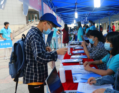 同学们有的在校门口辛苦地举着院旗接应,有的在接待处耐心地接受新同学的咨询,有的微笑着为学弟学妹办理手续,还有部分同学因场地有限—直默默地坐在台阶上等待着新同学办理完手续便带领他们去往宿舍区。由于今年的特殊情况,新同学都独自一人来到学校,负责接送新生的志愿者非常辛苦,甚至在最炎热的中午他们也主动积极地要求接送并细心地接过新同学的行李,毫无怨言。