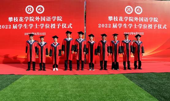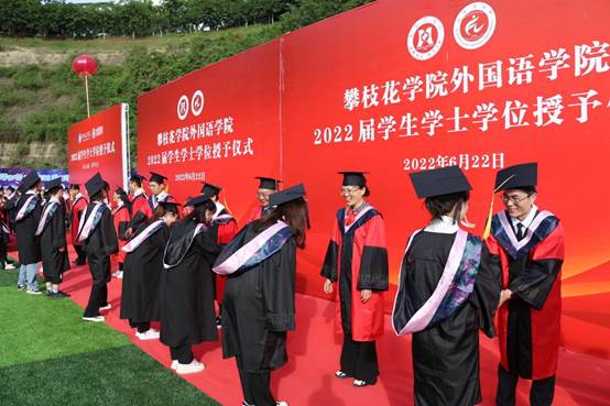 6月22号上午,攀枝花学院2022届全体毕业生学士学位授予仪式于本部运动场举行。我院2022届毕业生在外国语学院学士学位授予分会场进行,我院廖红、付乔、李翔、陈顺江、冉明志、崔朝晖、孙鹏、王欢、樊习英和何学德10位老师出席了此次学士学位授予仪式。