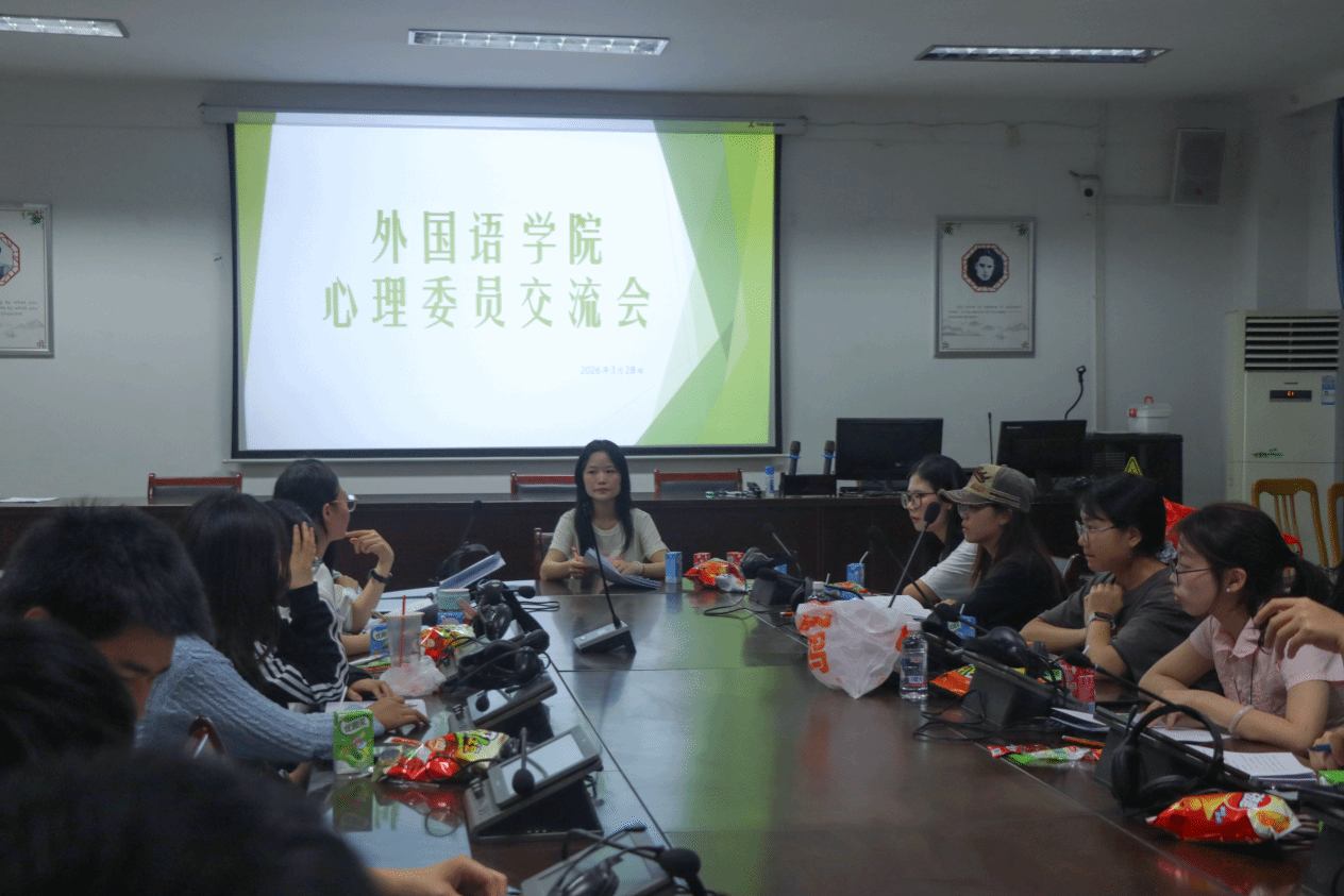 2026年3月28日晚,我院学生会心理健康部于公园校区明德楼三楼同传室组织召开心理委员交流会。本次会议由心理健康部部长刘彦孜主持,心理健康部干事及各年级心理委员出席会议。