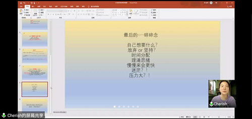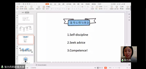 刘宝玲给同学们分享有关学前教育方面的经验,她先讲了一些有关考研的细节,随后讲自己为何要选择学前教育专业,并结合自己的亲身经历讲述不同学校的复试的情况。张力月讲述了自己的备考心得与体会,介绍了考研流程,并指出获取考研信息渠道、掌握有效信息是备战考研的第一步。