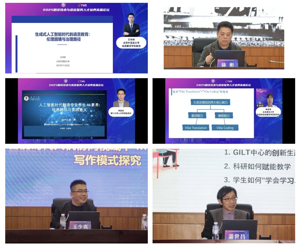 论坛深入探讨了“翻译伦理与困境”“语言服务架构”“AI素养培育路径”等话题。北京外国语大学高级翻译学院教授王华树、北京语言大学英语和高级翻译学院副院长韩林涛、澳门大学人文学院副院长李德凤、世界翻译教育联盟理事长、山东师范大学教授徐彬等多位专家围绕生成式AI时代的翻译教育发表主旨演讲,为AI时代下的人与智能共生之路提供了新思路、新思考。