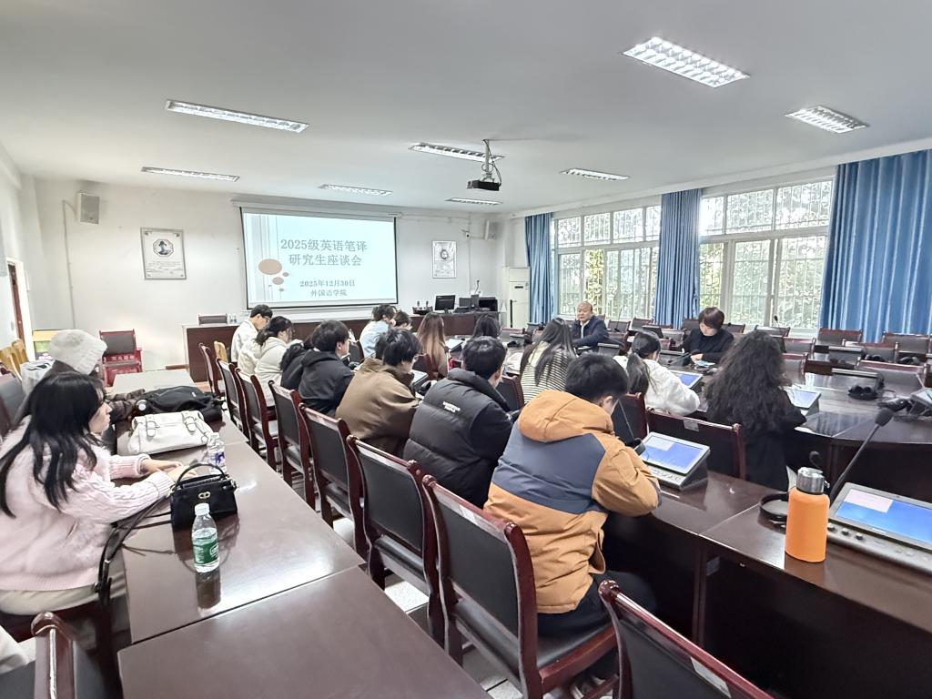 为深入了解首届翻译硕士研究生的学习动态与发展需求,进一步优化培养方案、提升育人质量,我院于2025年12月30日组织召开了2025级翻译硕士研究生座谈会。我院院长高朝阳,研究生辅导员杨洁,研究生培养相关科室老师和全体研究生出席座谈会。